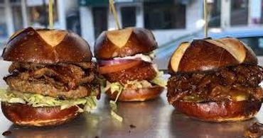Not for the faint of hearts, and eager to win this battle. this burger has three plant based patties with cheese on each. accompanied by lettuce, tomato and mayo on a soft pretzel bun.